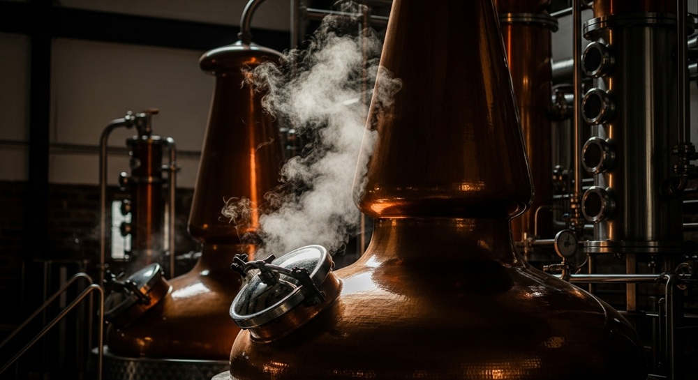 蒸留は、アルコールを濃縮し、余分な水分や不要成分を取り除く工程です。