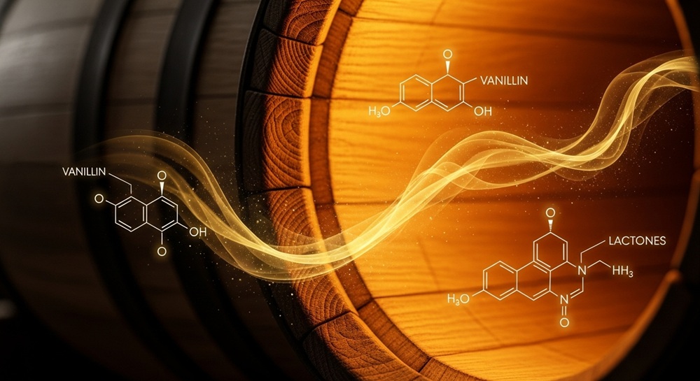 熟成の過程では、オーク樽から バニリン や ウイスキーラクトン、フェニルアルコール類といった成分が抽出されます。