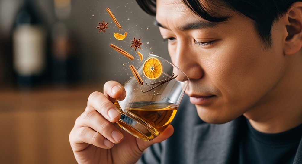 こうした香味要素は、温度、加水、グラスの形、周囲の香りなどで変化します。